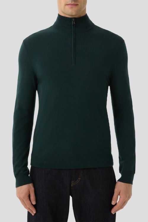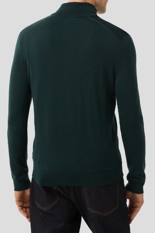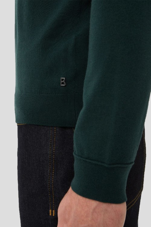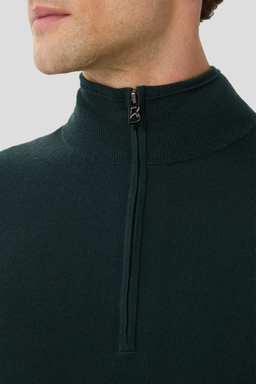 Детали: Мужской темно-зеленый шерстяной джемпер Ouri от Bogner (Богнер). Воротник стойка с застежкой на молнию, классическая длина, манжеты и нижний край в рубчик