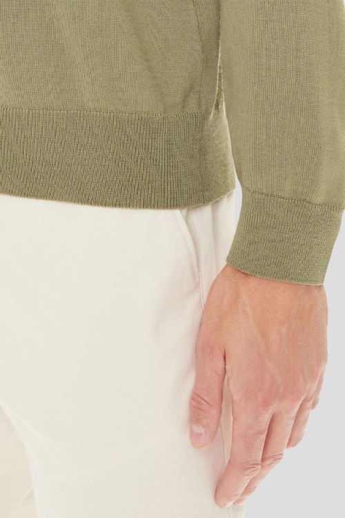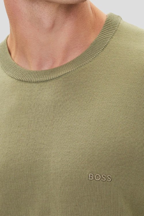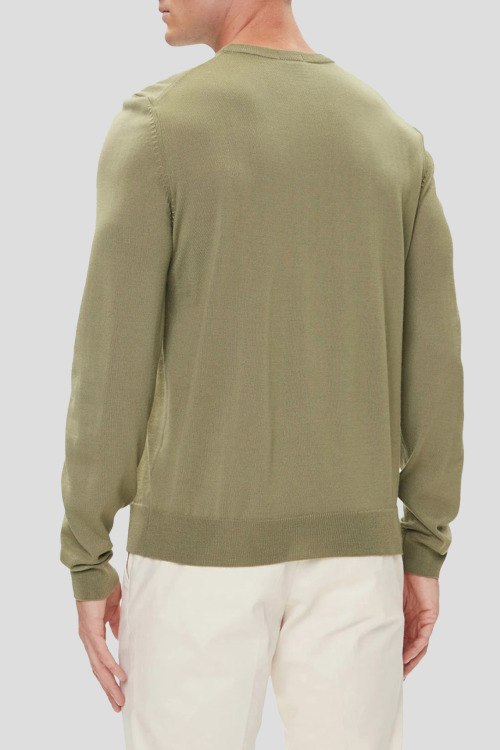 Детали: Мужской оливковый шерстяной джемпер Botto от Hugo Boss (Хуго Босс). Логотип на груди, круглый вырез горловины, классическая длина, ребристые манжеты и нижний край