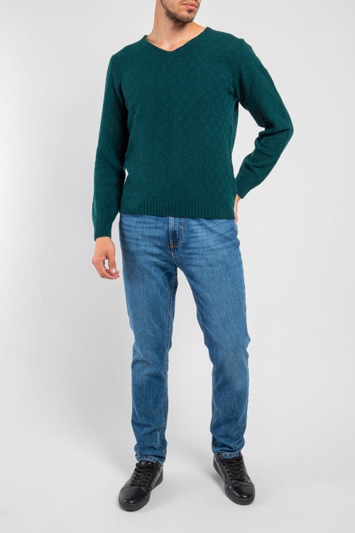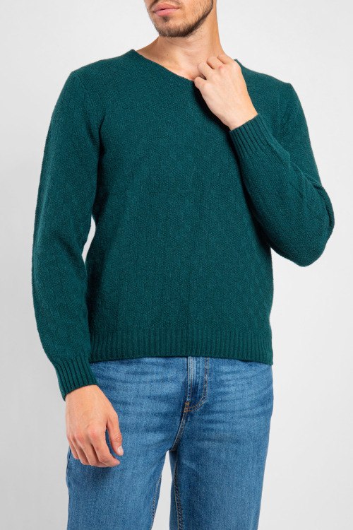 Мужской темно-зеленый пуловер из микса шерсти от Piacenza Cashmere (Пьяченца Кашемир). Классическая длина, V-образный вырез горловины, дизайн с узором, длинные рукава, трикотажная резинка на манжетах и по низу изделия. Модель с парфюмированной пропиткой.