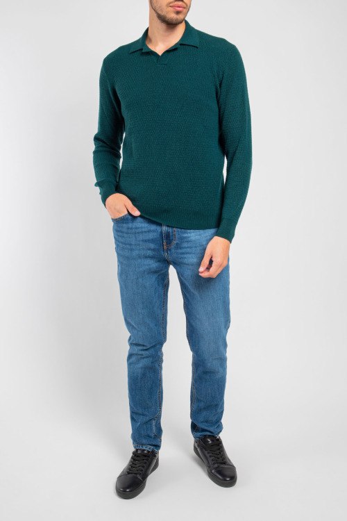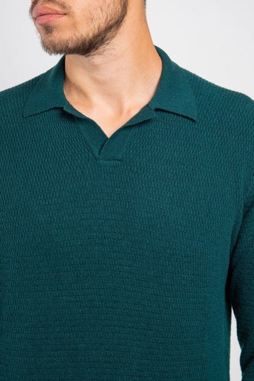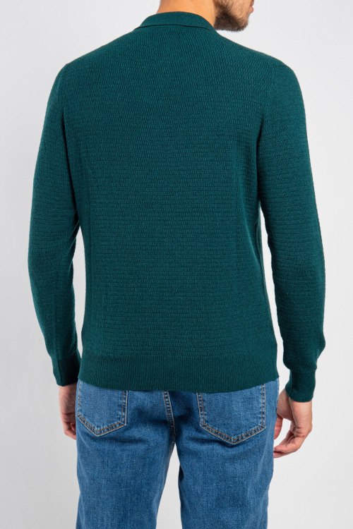 Детали: Мужской темно-зеленый джемпер-поло из кашемира от Piacenza Cashmere (Пьяченца Кашемир). Классическая длина, отложной воротник, V-образный вырез горловины, длинные рукава, трикотажная резинка на манжетах и по низу изделия. Модель с парфюмированной пропиткой
