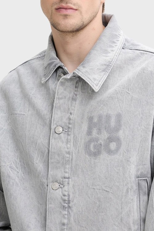 Детали: Мужская светло-серая джинсовая куртка от Hugo by Hugo Boss (Хуго бай Хуго Босс). Логотип на груди и на спине, отложной воротник, застежка на пуговицы, манжеты на пуговицах, боковые карманы, классическая длина