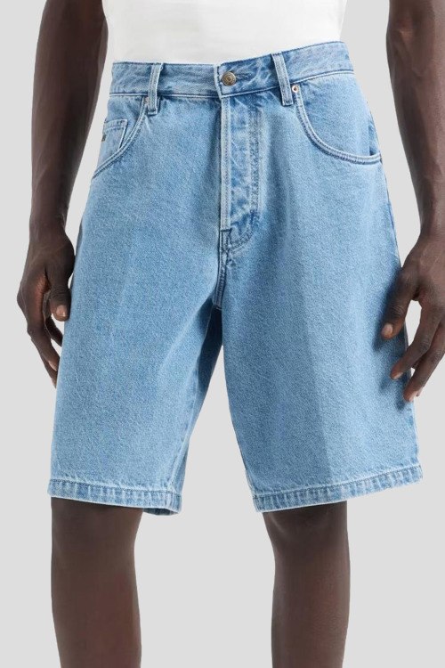Детали: Мужские голубые джинсовые шорты от Emporio Armani (Эмпорио Армани). Пяти-карманная модель, пояс с петлями для ремня, нашивка с логотипом сзади на поясе, длина до колен