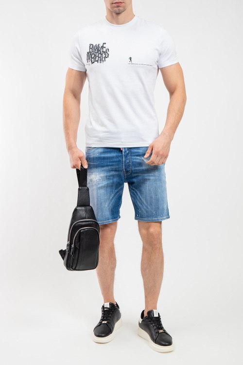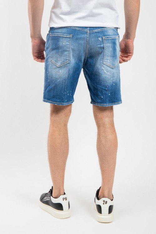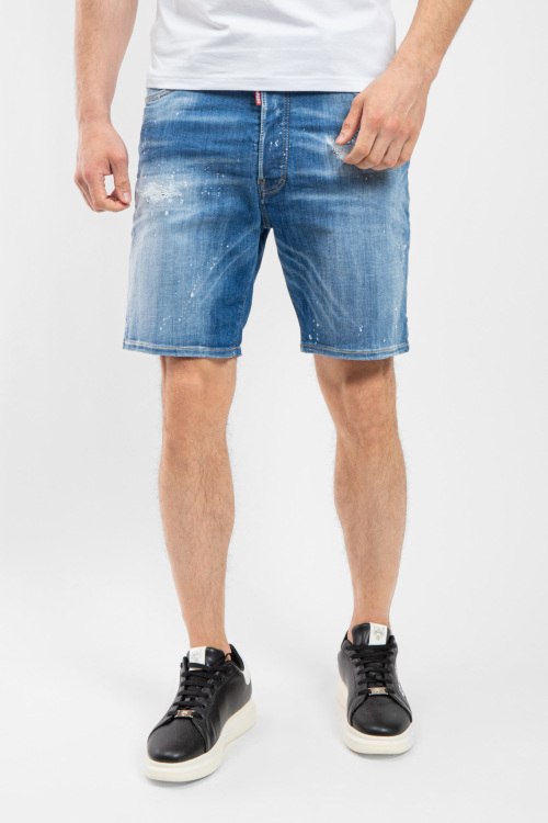 Мужские голубые джинсовые шорты из хлопкового микса от Dsquared2 (Дискваред). Длина до колена,. высокая посадка, застежка на молнию и пуговицу, пять карманов, петли в поясе для ремня, логотип бренда, дизайн с потертостями.