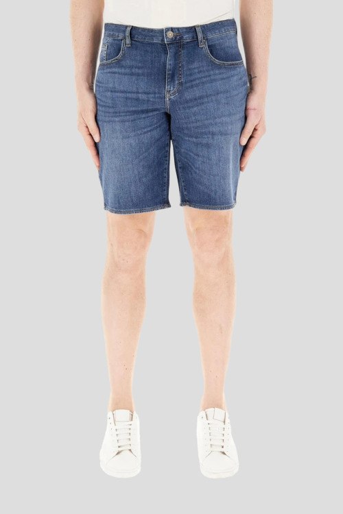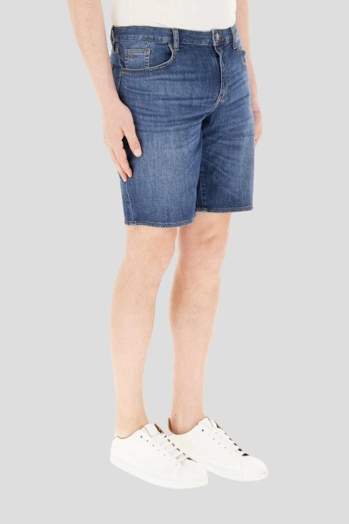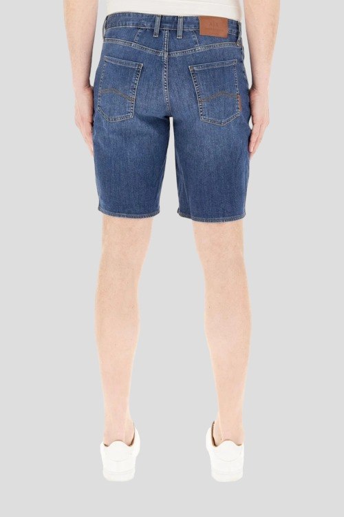 Детали: Мужские синие джинсовые шорты от Armani Exchange (Армани Эксчендж). Пяти-карманная модель, пояс с петлями для ремня, нашивка с логотипом сзади на поясе, длина выше колен