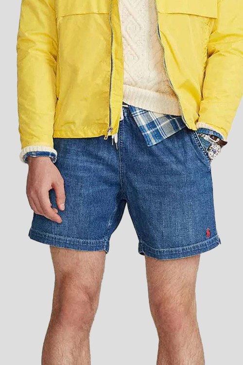 Мужские синие джинсовые шорты из хлопка от Polo Ralph Lauren (Поло Ральф Лорен). Эластичная резинка на поясе с кулиской, четыре кармана, вышитый логотип бренда
