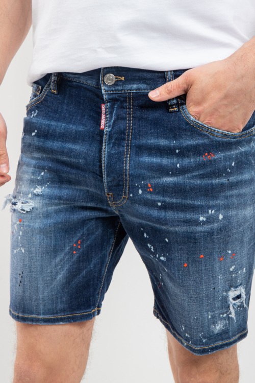 Мужские темно-синие шорты из хлопкового микса от Dsquared2 (Дискваред). Длина до колена, дизайн с потертостями, эффект разбрызганной краски, застежка на молнию и пуговицу, пять карманов, петли в поясе для ремня, патч-лого.