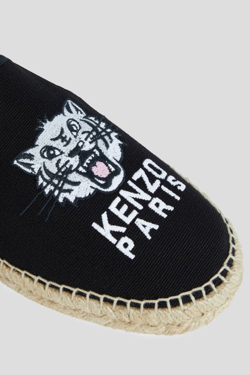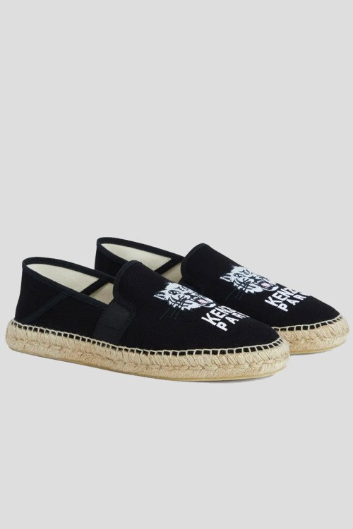 Детали: Мужские черные эспадрильи Tiger Head из хлопка от Kenzo (Кензо). Закругленный носок, плетенная вставка вдоль подошвы, по бокам эластичная резинка, вышитый логотип бренда спереди