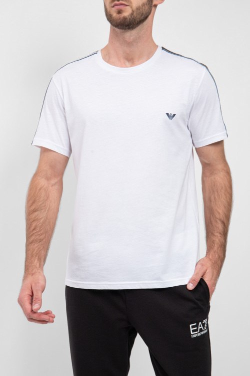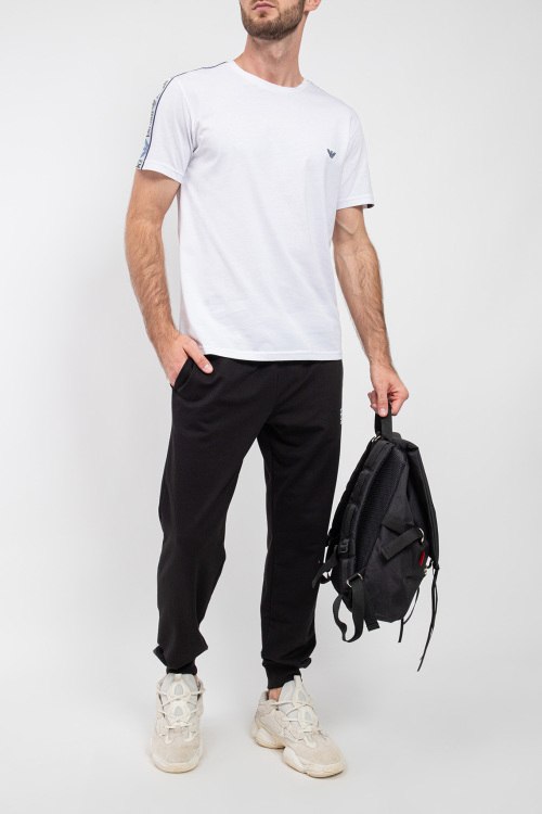 Детали: Мужская белая хлопковая футболка от Armani (Армани). Принт с логотипом на груди, брендированные лампасы, круглый вырез горловины, короткий рукав, классическая длина