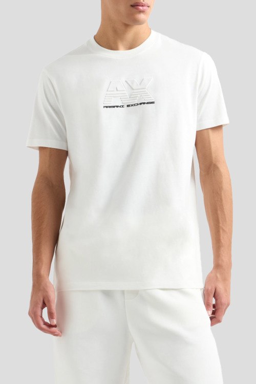 Детали: Мужская белая хлопковая футболка от Armani Exchange (Армани Эксчендж). Логотип на груди, круглый вырез горловины, короткий рукав, классическая длина