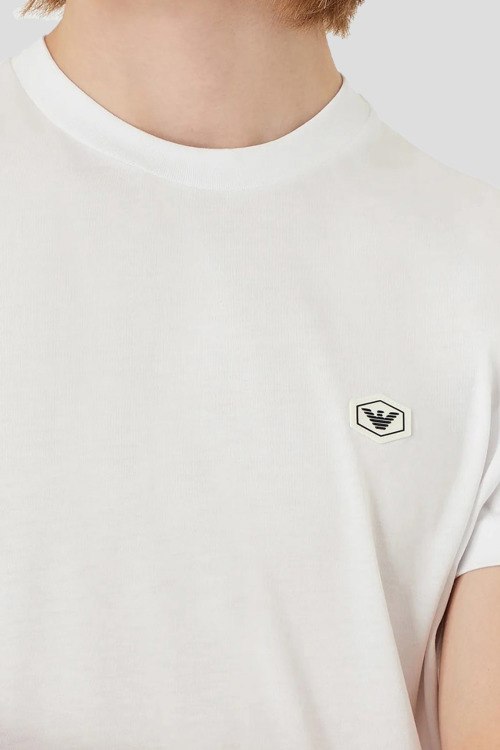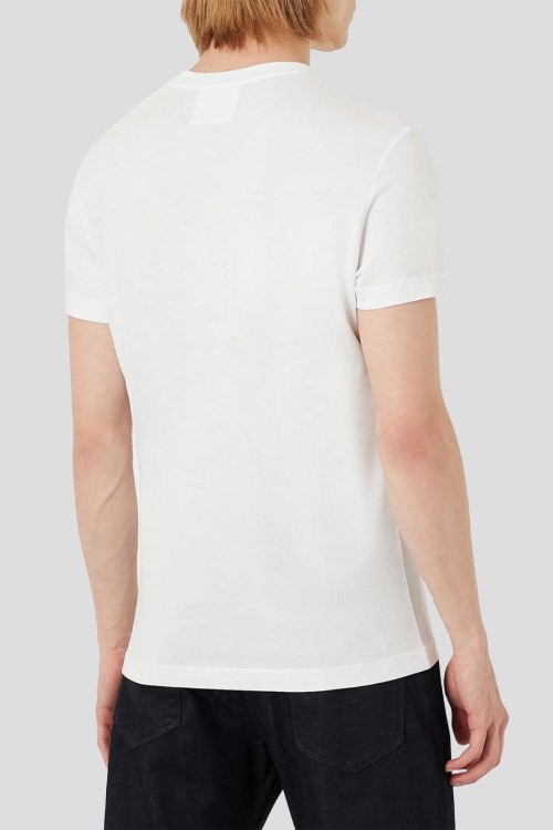 Детали: Мужская белая хлопковая футболка от Emporio Armani (Эмпорио Армани). Логотип на груди, круглый вырез горловины, короткий рукав, классическая длина