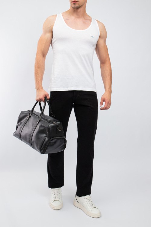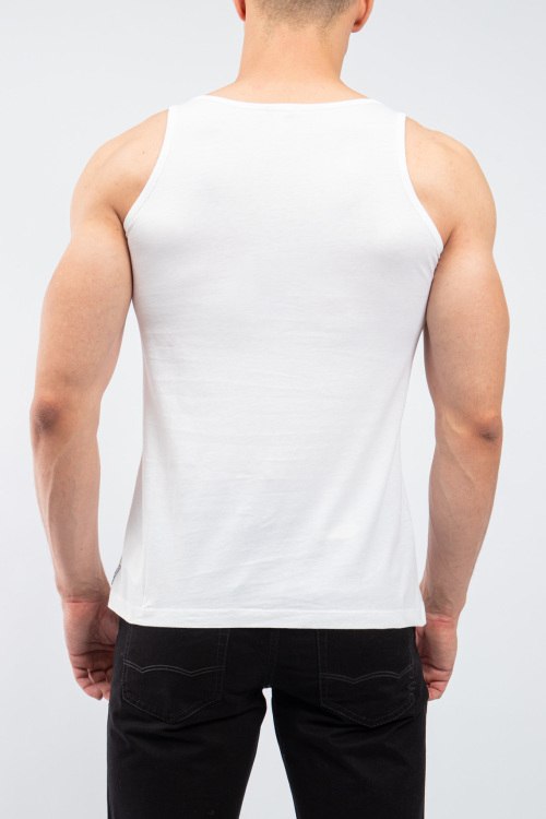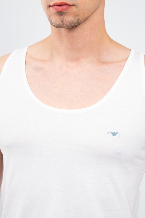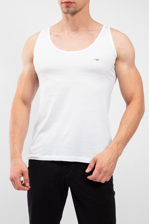 Детали: Мужская белая хлопковая майка от Emporio Armani (Эмпорио Армани). Модель без рукавов, логотип на груди, круглый вырез, классическая длина