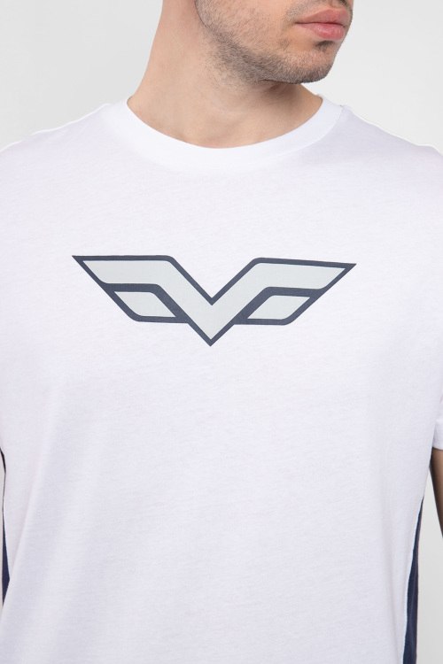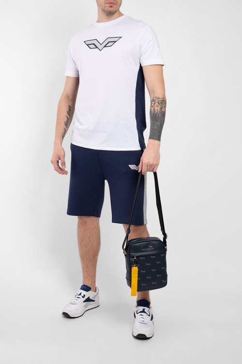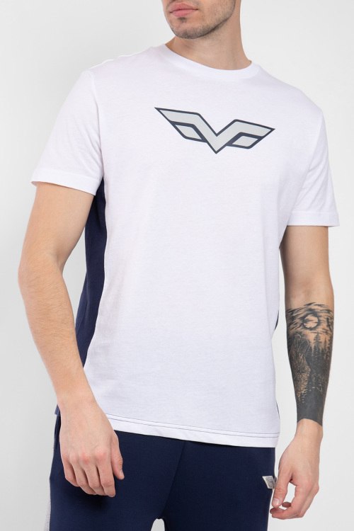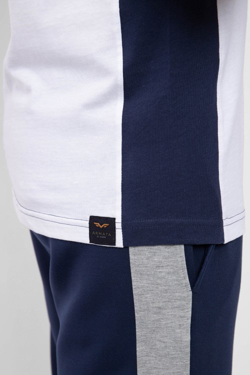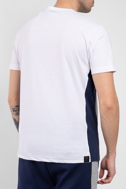 Мужская белая футболка из хлопка от Armata di Mare (Армата ди Маре). Круглый вырез горловины, короткие рукава, контрастные лампасы, логотип бренда на груди, патч-лого по нижнему краю изделия.