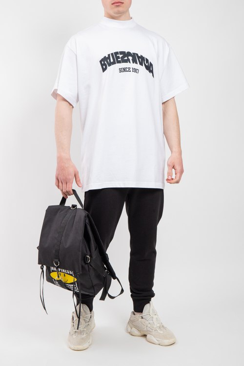 Мужская белая футболка из хлопка от Balenciaga (Баленсиага). Классическая длина, модель oversize, круглый вырез горловины, короткие рукава, модель декорирована вышитым логотипом бренда на груди.