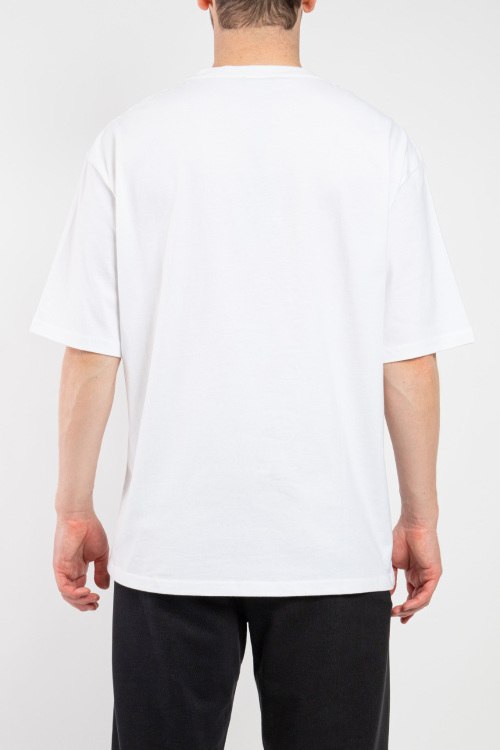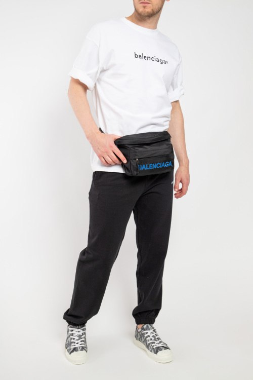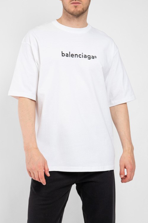 Мужская белая хлопковая футболка от Balenciaga (Баленсиага). Принт с логотипом на груди, круглый вырез горловины, короткий рукав, классическая длина