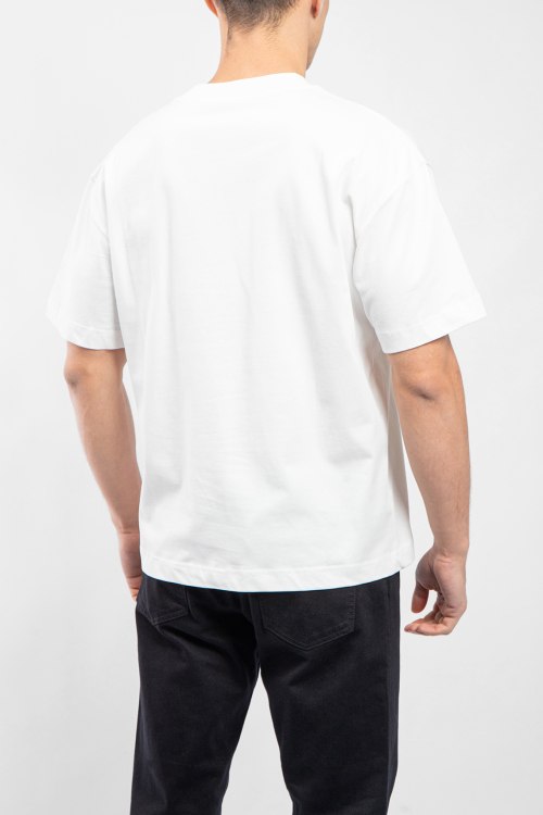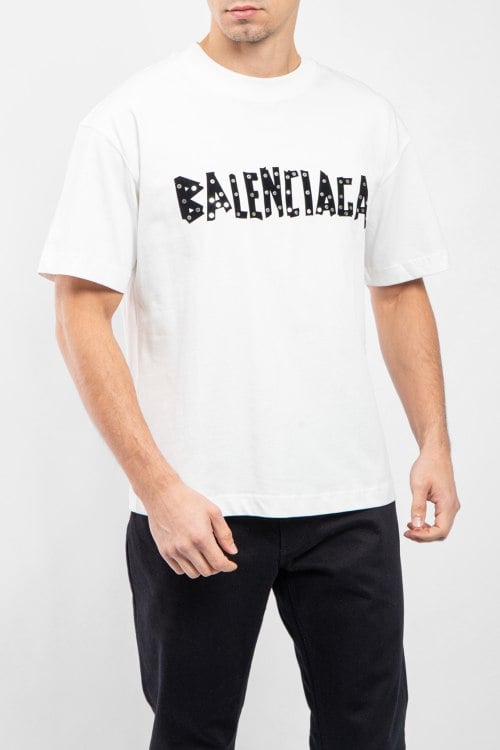 Мужская белая хлопковая футболка от Balenciaga (Баленсиага). Логотип на груди с металлическими заклепками, круглый вырез горловины, короткий рукав, классическая длина.
