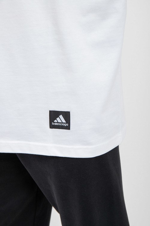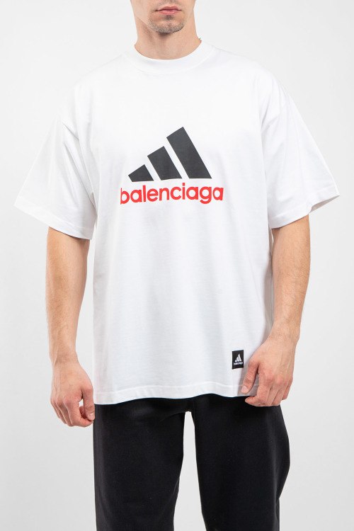 Мужская белая футболка oversize из хлопка от Balenciaga (Баленсиага). Модель из коллаборации Balenciaga x Adidas, круглый вырез горловины, короткие рукава, принт с логотипом бренда на груди.