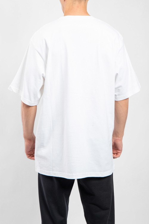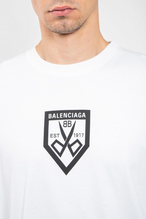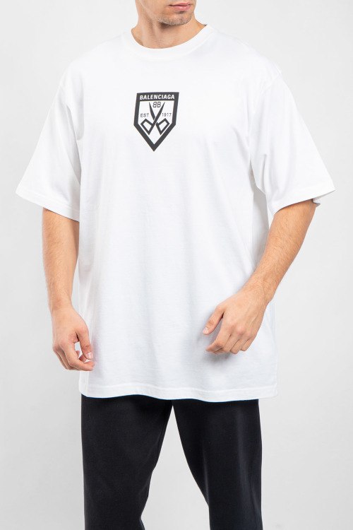 Мужская белая хлопковая футболка от Balenciaga (Баленсиага). Фасон oversize, логотип на груди, круглый вырез горловины, короткий рукав, удлиненная длина.