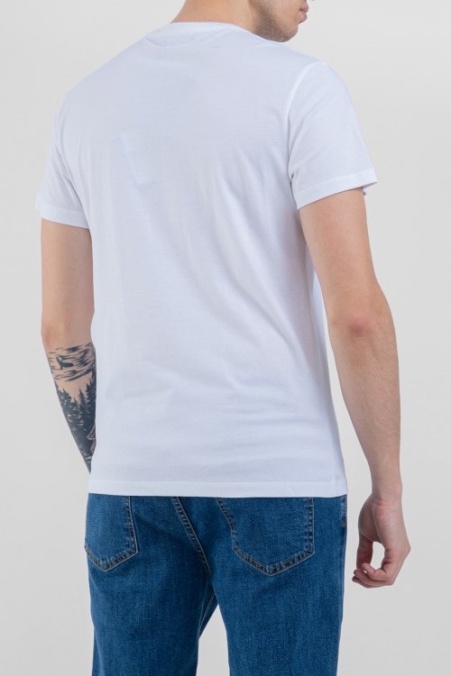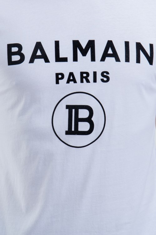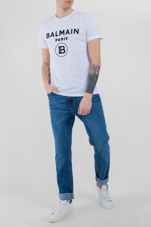 Мужская белая футболка из хлопка от Balmain (Бальман). Классическая длина, короткие рукава, круглый вырез горловины, ровный низ изделия, декор: принт с логотипом бренда