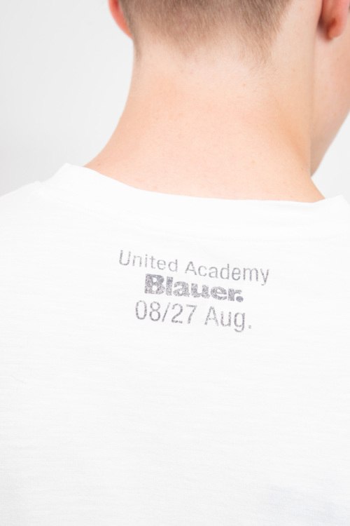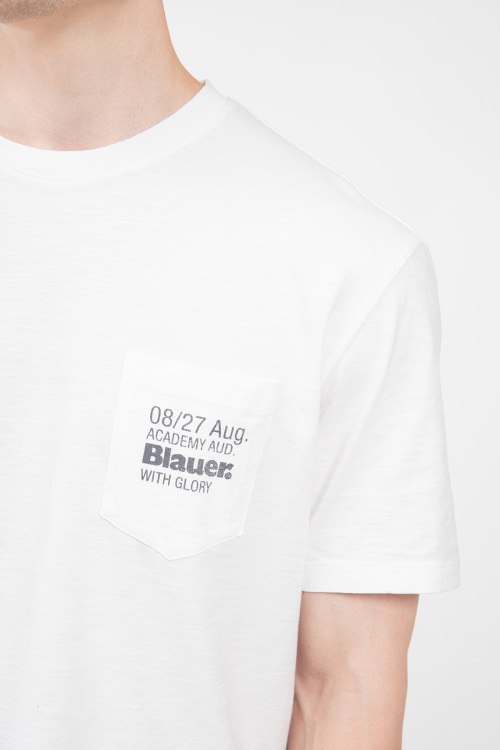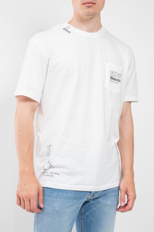 Детали: Мужская белая хлопковая футболка от Blauer (Блауэр). Накладной карман на груди с логотипом, круглый вырез горловины, короткий рукав, классическая длина