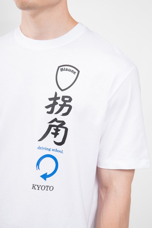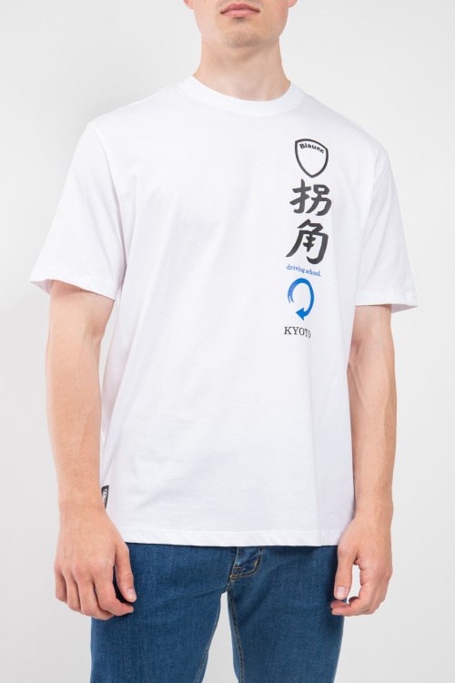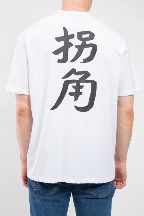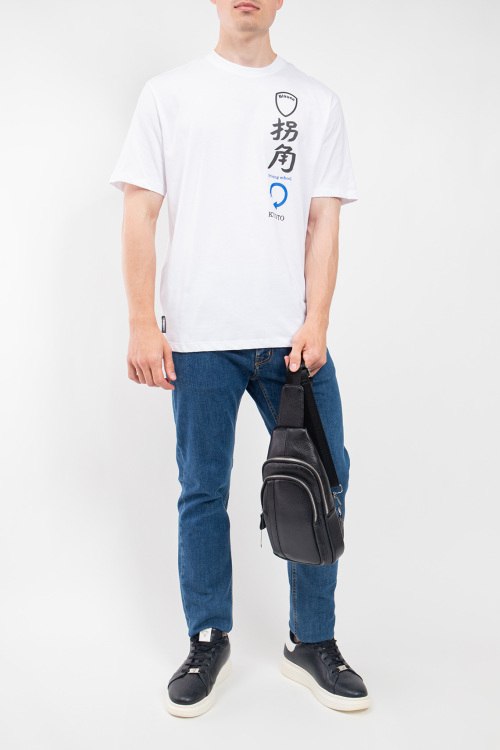 Детали: Мужская белая хлопковая футболка от Blauer (Блауэр). Принты иероглифов на груди и на спине, круглый вырез горловины, короткий рукав, классическая длина