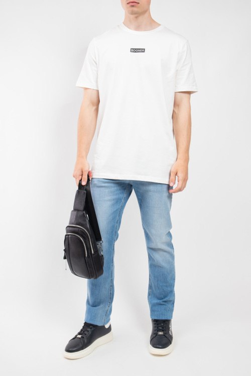 Детали: Мужская белая хлопковая футболка Roc от Bogner (Богнер). Принт с логотипом на груди, круглый вырез горловины, короткий рукав, классическая длина