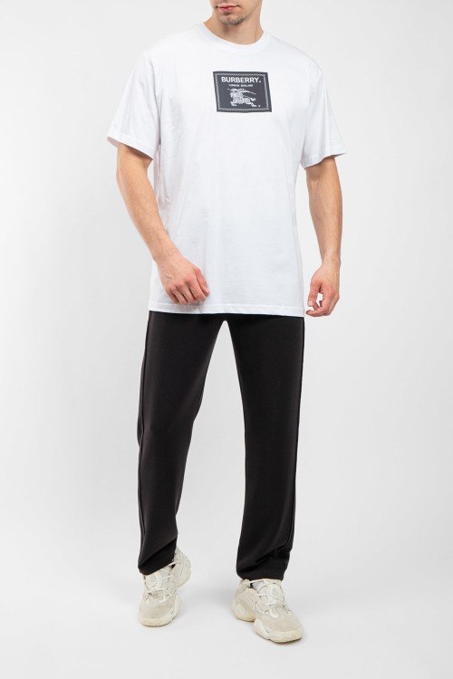 Мужская белая хлопковая футболка от Burberry (Бёрберри). Логотип на груди, круглый вырез горловины, короткий рукав, удлиненная длина.