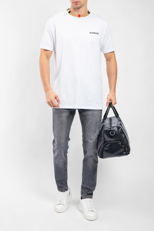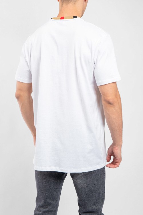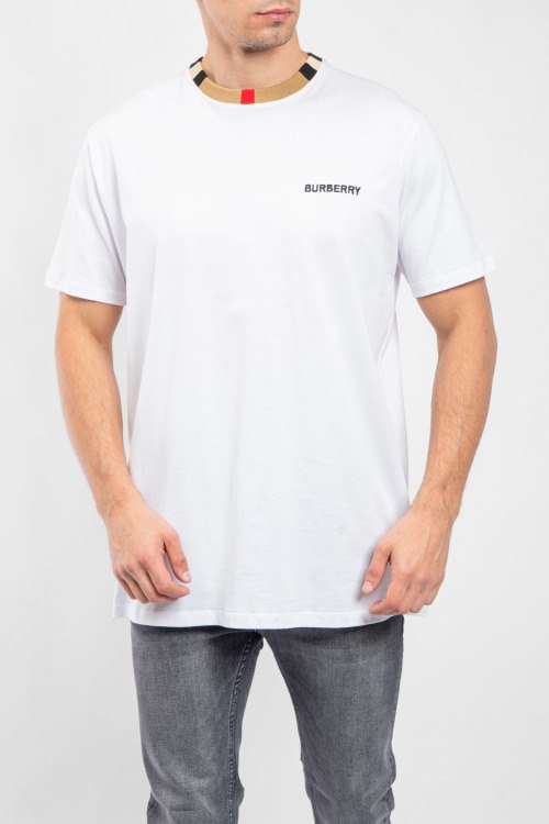 Мужская белая хлопковая футболка от Burberry (Бёрберри). Логотип на груди, круглый вырез горловины с фирменной отделкой, короткий рукав, удлиненная длина.