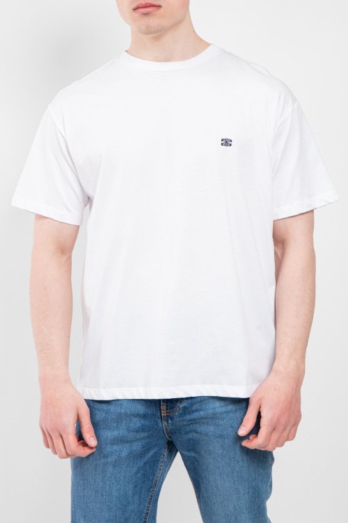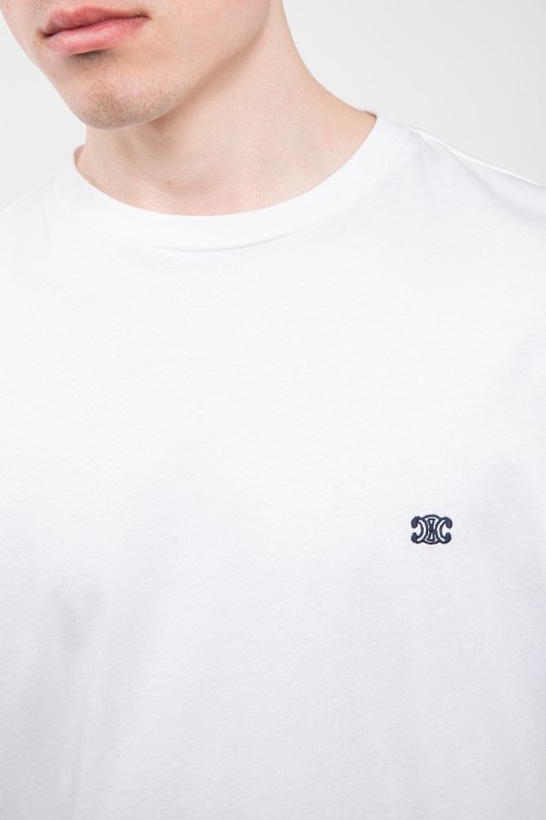 Мужская белая футболка из хлопка от Celine (Селин). Классическая длина, круглый вырез горловины, короткие рукава, вышитый логотип бренда на груди.