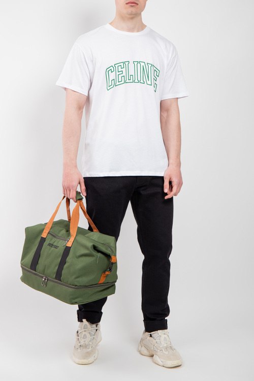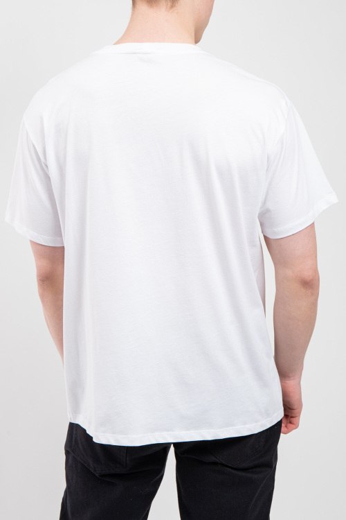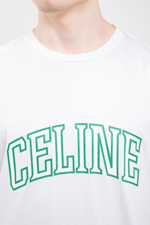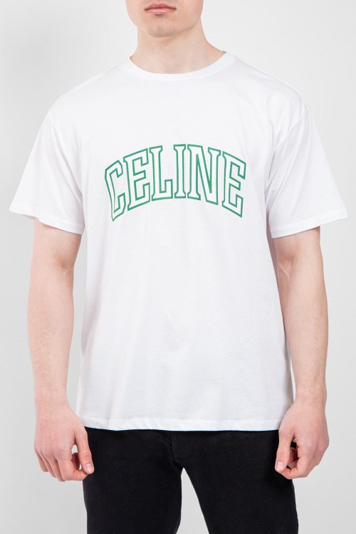 Мужская белая футболка из хлопка от Celine (Селин). Классическая длина, круглый вырез горловины, короткие рукава, брендированный принт на груди.