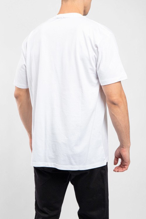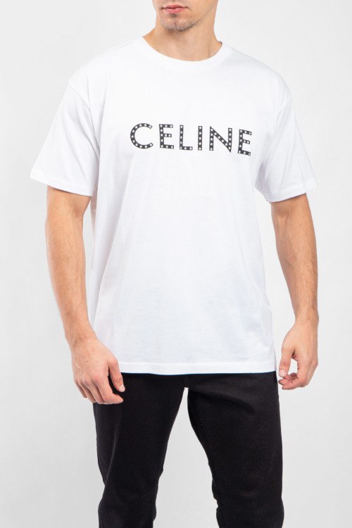 Мужская белая хлопковая футболка от Celine (Селин). Логотип на груди, круглый вырез горловины, короткий рукав, классическая длина.