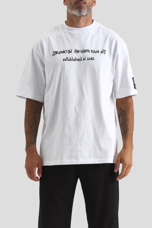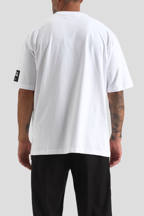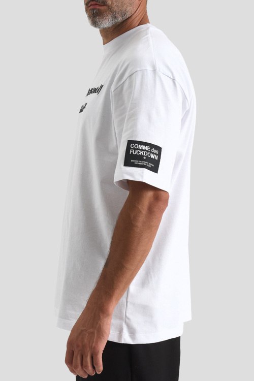 Детали: Мужская белая футболка из хлопка от Comme des Fuckdown (Камм дес Факдаун). Круглый вырез горловины, короткие рукава, модель декорирована принтом на груди, патч-лого на рукаве