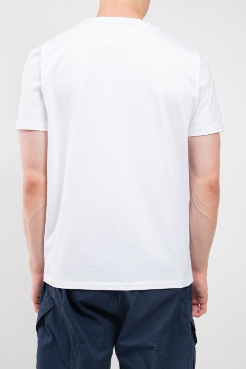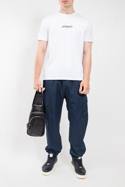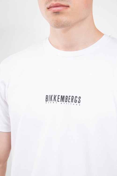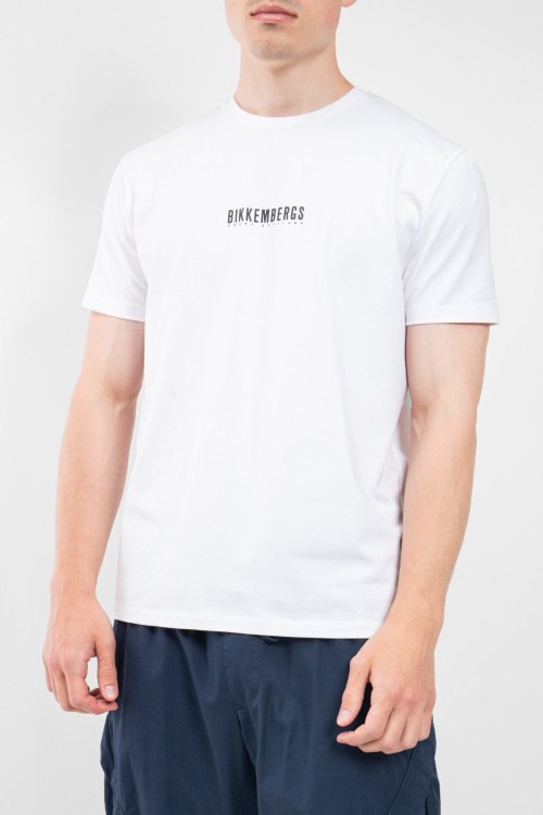 Детали: Мужская белая хлопковая футболка от Bikkembergs (Биккембергс). Принт с логотипом на груди, круглый вырез горловины, короткий рукав, классическая длина