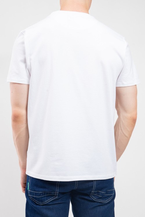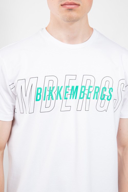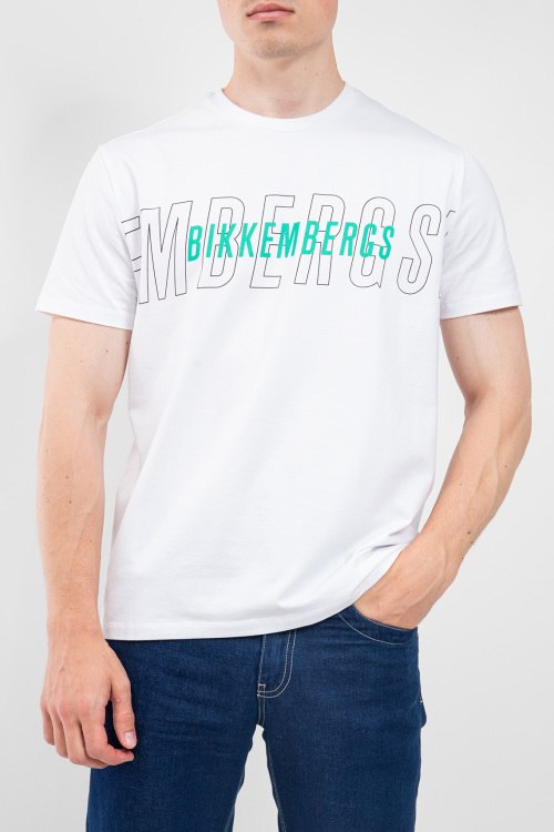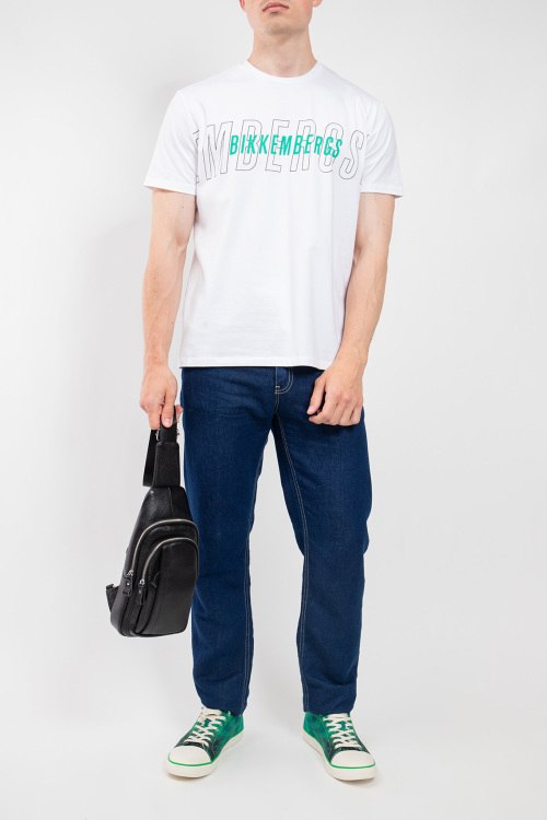 Детали: Мужская белая хлопковая футболка от Bikkembergs (Биккембергс). Принт с логотипом на груди, круглый вырез горловины, короткий рукав, классическая длина