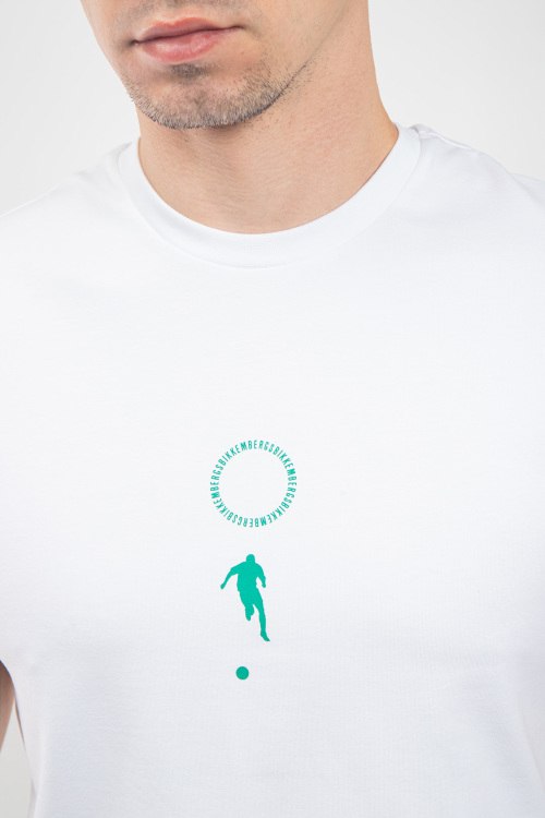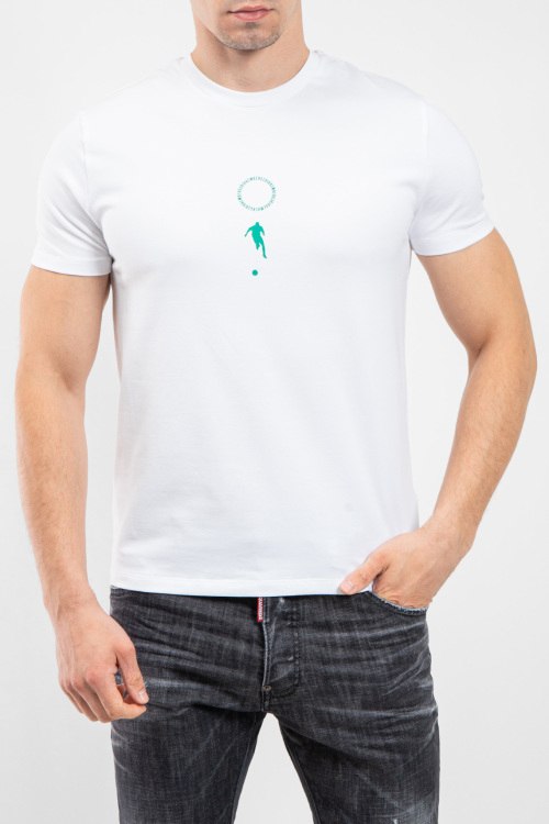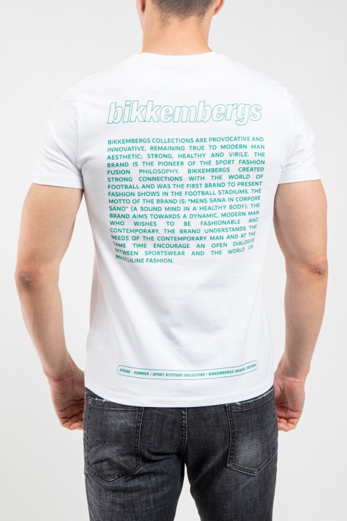 Мужская белая футболка из хлопка от Bikkembergs (Биккембергс). Классическая длина, круглый вырез горловины, короткие рукава, декорирована принтом на груди и на спине.