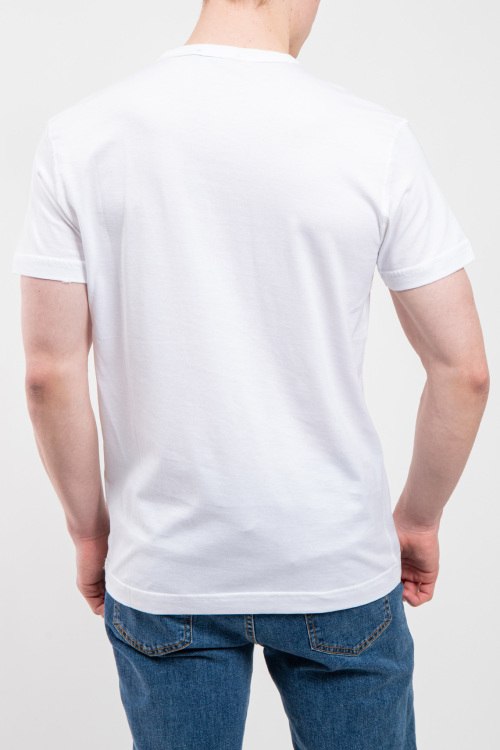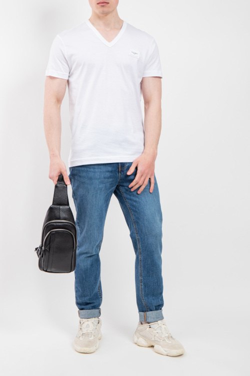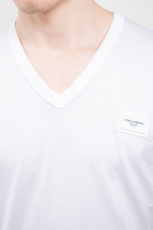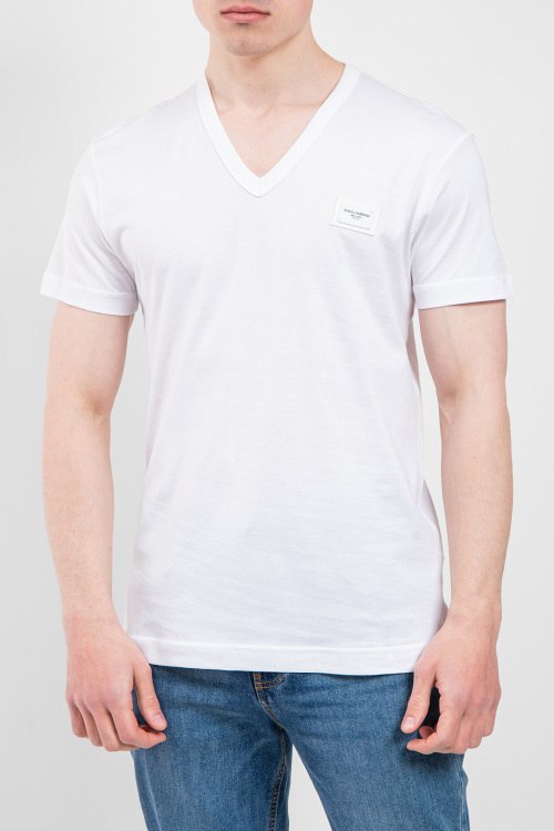 Мужская белая футболка из хлопка от Dolce & Gabbana (Дольче энд Габбана). Классическая длина, V-образный вырез горловины, короткие рукава, патч-лого.