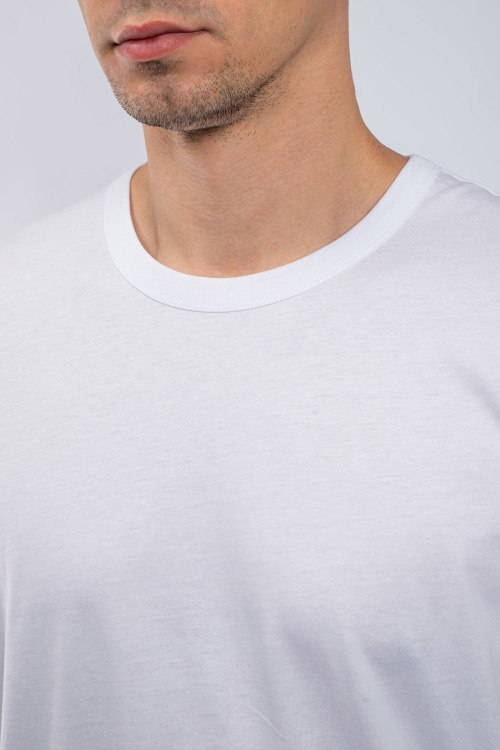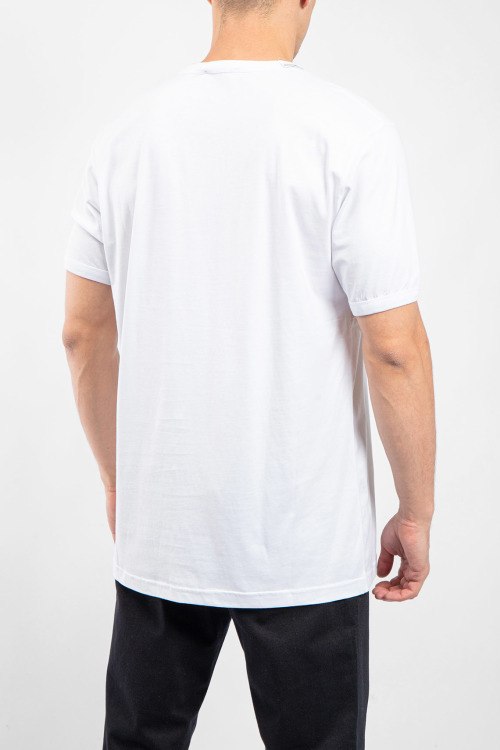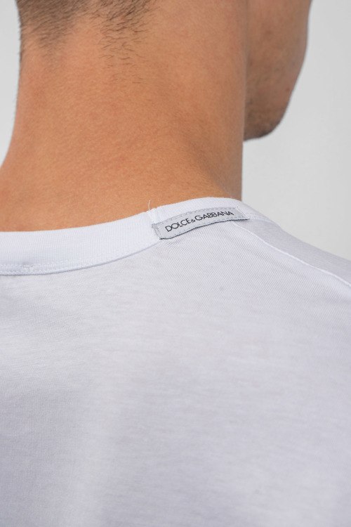 Мужская белая хлопковая футболка от Dolce & Gabbana (Дольче энд Габбана). Круглый вырез горловины с нашивкой логотипа, короткий рукав, удлиненная длина.