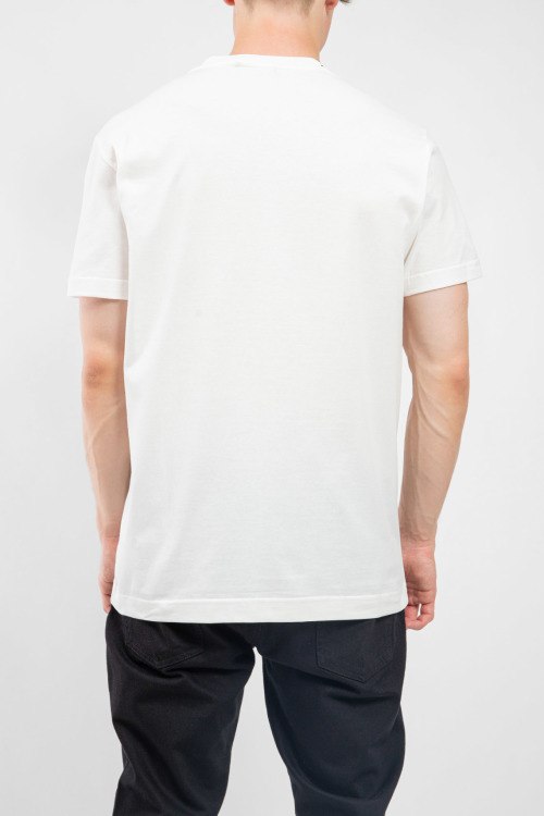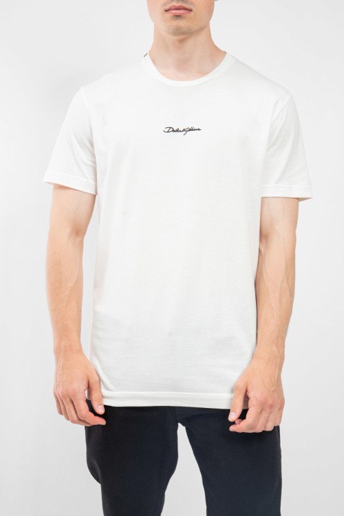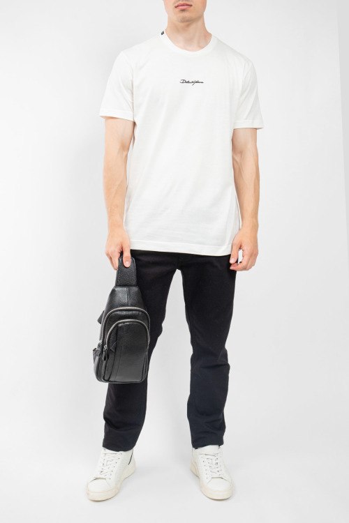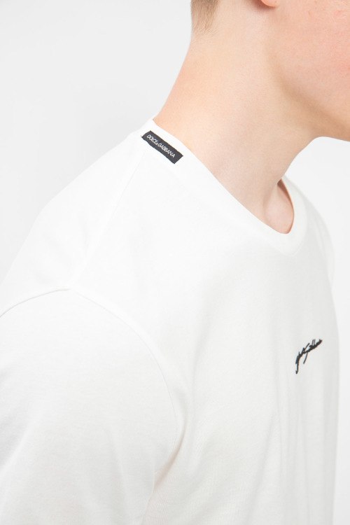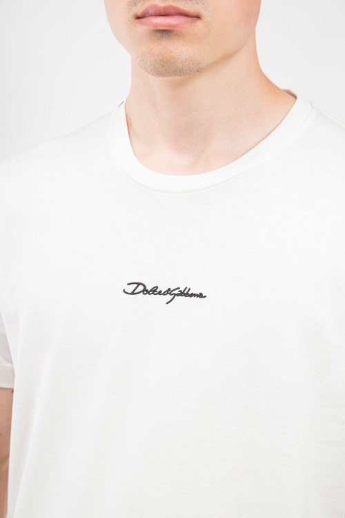 Мужская белая хлопковая футболка от Dolce & Gabbana (Дольче энд Габбана). Вышитый логотип на груди, круглый вырез горловины с нашивкой логотипа, короткий рукав, классическая длина.