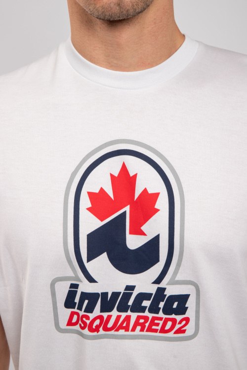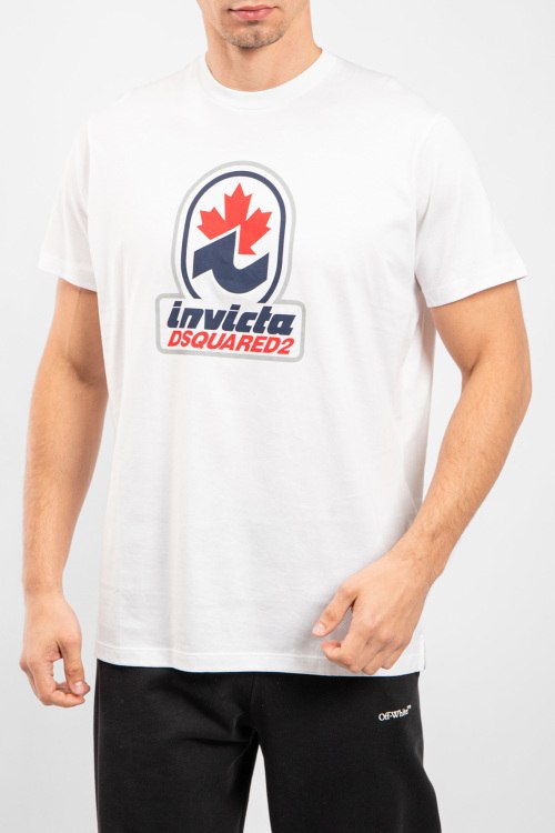 Мужская белая хлопковая футболка D2 Invicta от Dsquared2 (Дискваред). Логотип на груди, круглый вырез горловины, короткий рукав, удлиненная длина.