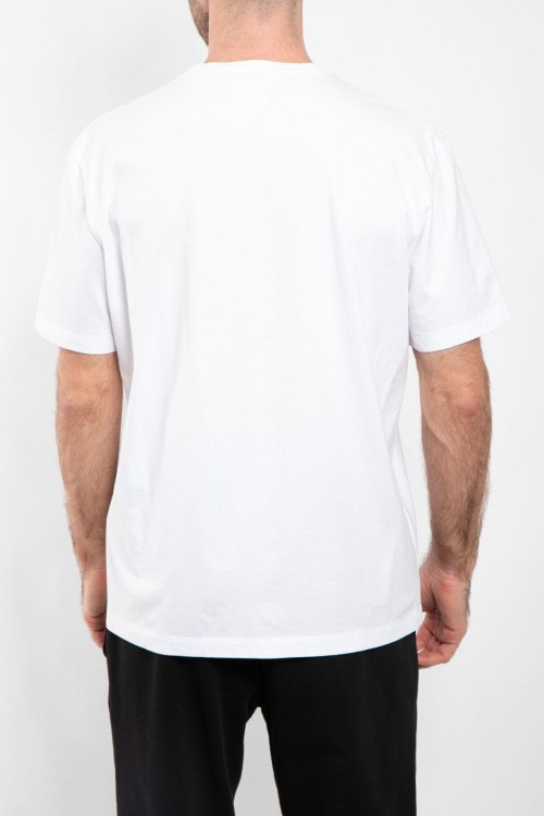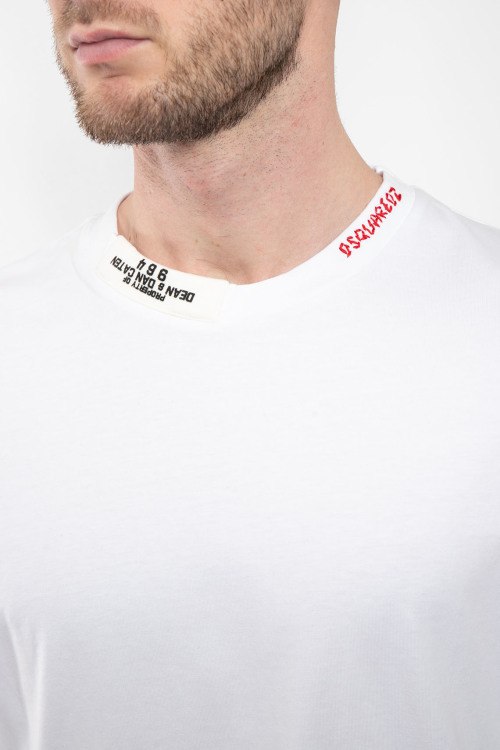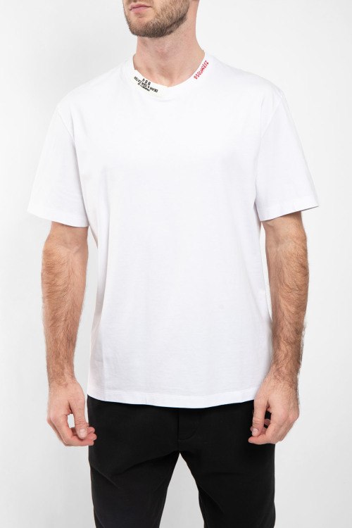 Мужская белая хлопковая футболка от Dsquared2 (Дискваред). Нашивка с логотипом, круглый вырез горловины, короткий рукав, классическая длина.