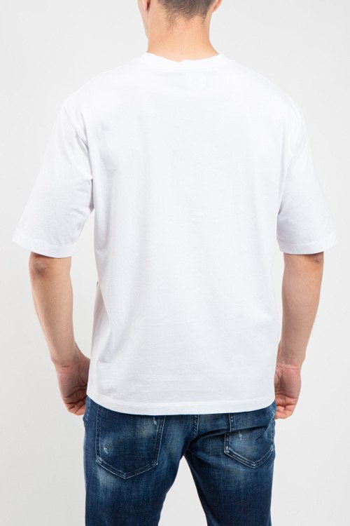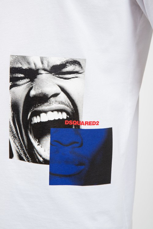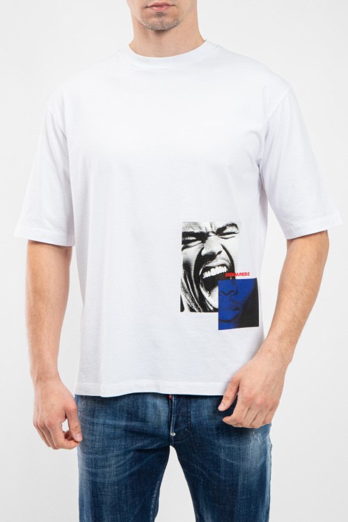 Мужская белая футбола из хлопка от Dsquared2 (Дискваред). Классическая длина, круглый вырез горловины, короткие рукава, модель декорирована графическим принтом с логотипом бренда.
