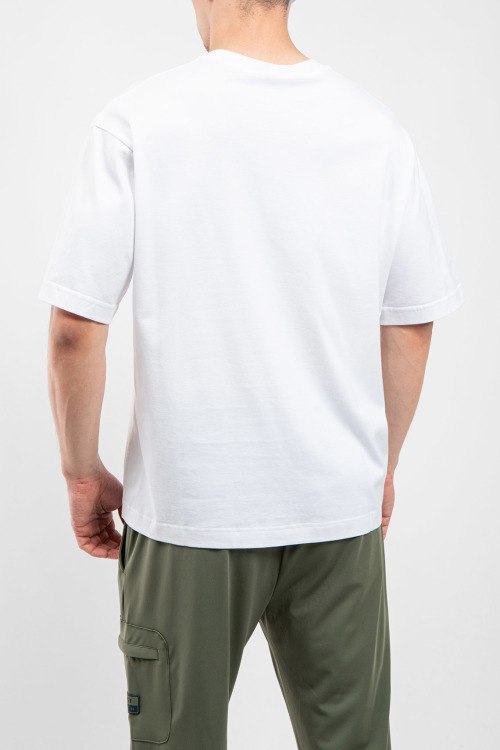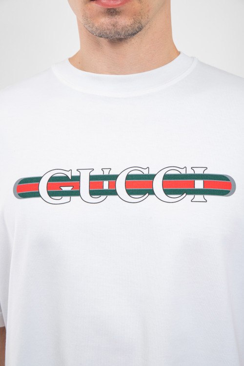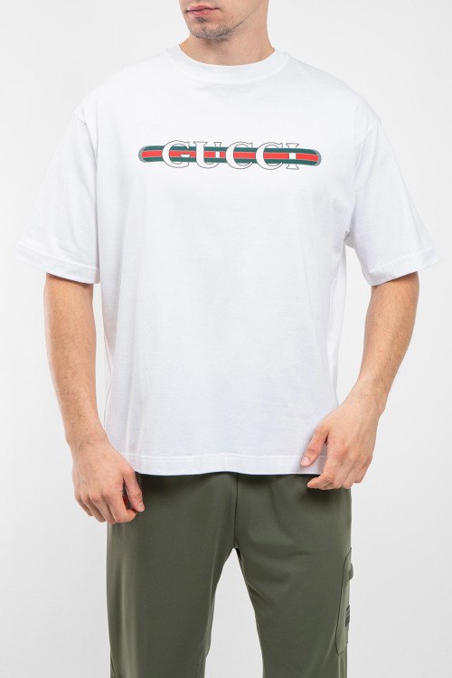 Мужская белая футболка из хлопка от Gucci (Гуччи). Классическая длина, круглый вырез горловины, короткие рукава, брендированный принт на груди. На модели снят размер - M. Параметры модели: рост 189 см, 103-78-104 см