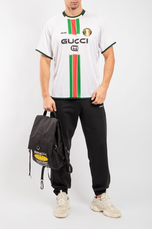 Мужская белая хлопковая футболка Palace x Gucci от Gucci (Гуччи). Принт на груди и на спине, круглый вырез горловины, короткий рукав, классическая длина.
