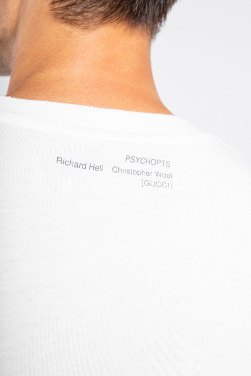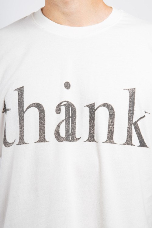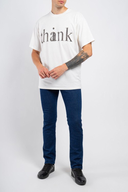 Мужская белая хлопковая футболка от Gucci (Гуччи). Графичный принт THANK, круглый вырез горловины, короткий рукав. По низу изделия, по краю рукавов и по горловине - слегка рванные детали