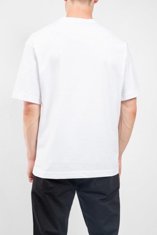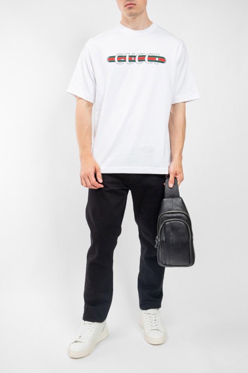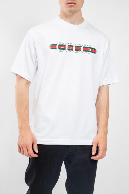 Мужская белая хлопковая футболка от Gucci (Гуччи). Модель оверсайз на два размера, принт с логотипом на груди, круглый вырез горловины, короткий рукав, классическая длина.
