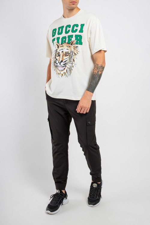 Мужская белая хлопковая футболка от Gucci (Гуччи). Принт с логотипом Gucci Tiger на груди, круглый вырез горловины, короткий рукав, классическая длина.