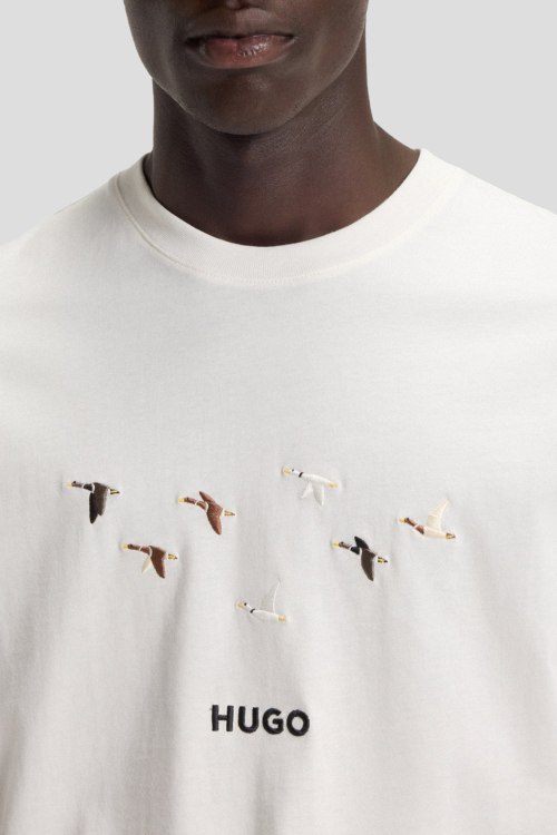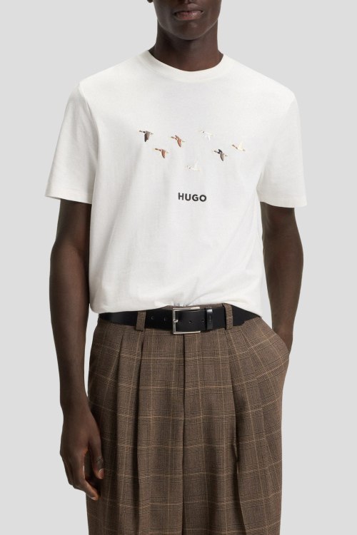 Детали: Мужская белая хлопковая футболка Dugolini от Hugo by Hugo Boss (Хуго бай Хуго Босс). Вышивка на груди, круглый вырез горловины, короткий рукав, классическая длина