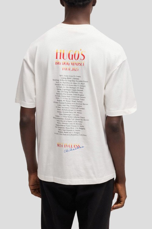 Детали: Мужская белая хлопковая футболка Dugie от Hugo by Hugo Boss (Хуго бай Хуго Босс). Принт на груди и на спине, круглый вырез горловины, короткий рукав, классическая длина