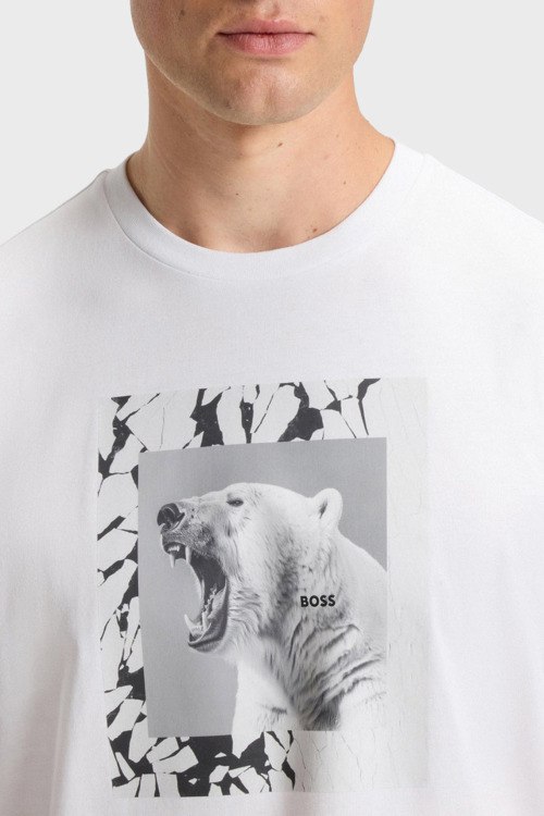 Детали: Мужская белая хлопковая футболка Lupo от Hugo Boss (Хуго Босс). Принт на груди, круглый вырез горловины, короткий рукав, классическая длина