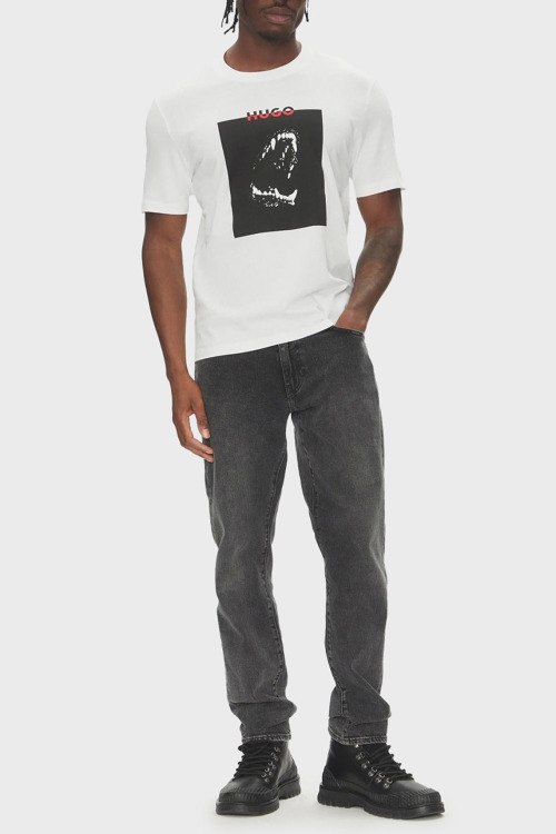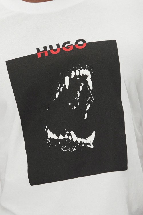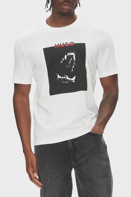 Детали: Мужская белая хлопковая футболка Dobero от Hugo by Hugo Boss (Хуго бай Хуго Босс). Принт на груди, круглый вырез горловины, короткий рукав, классическая длина