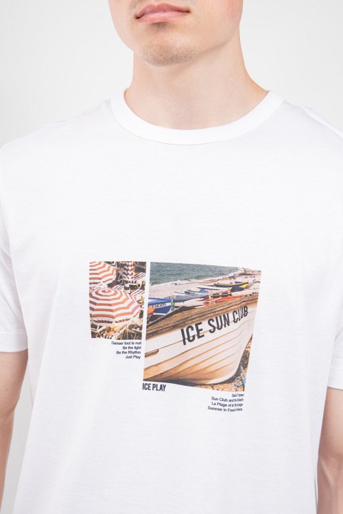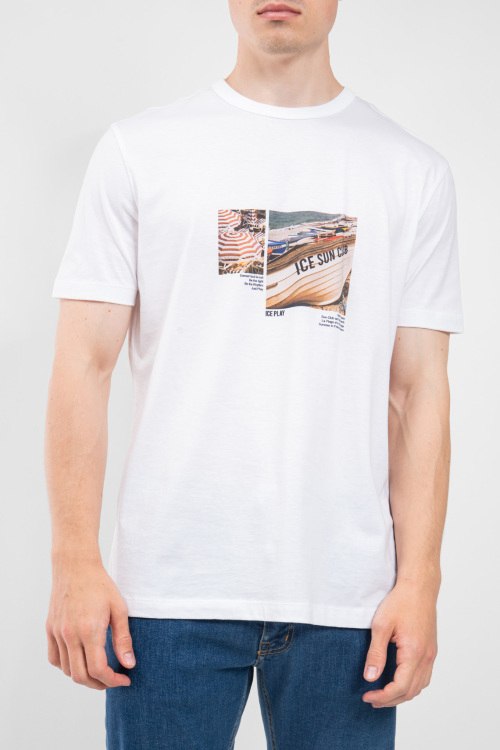 Детали: Мужская белая хлопковая футболка от Ice Play (Айс Плей). Принт на груди, круглый вырез горловины, короткий рукав, классическая длина